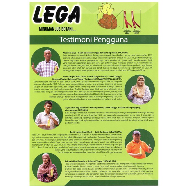 Testimoni Jus Lega : Prev 1 of 1 next.. Pengidap kencing manis yang selalu letih dan tak sihat. 1 sudu jus lega dicampurkan dengan secawan air suam. Jus lega membantu yang selalu merasai kesempitan dada bila bernafas dan risau tentang masalah sakit jantung untuk merasai kelegaan dan sihat. Pelbagai lagi testimoni yang berkaitan dgn penyakit2 kronik telah pun di temui setelah pesakit2 ini mengamalkan jus cordyceps ini. Jika dah amalkan jus qaswa.