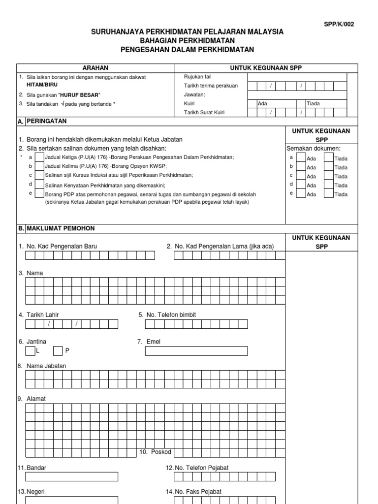 Perkhidmatan awam merupakan nadi utama bagi sesebuah negara, perkhidmatan awam yang efisyen, cepat, berdidikasi serta telus akan membantu memacu membangunkan sesebuah negara serta membantu rakyat jelata disetiap masa. Suruhanjaya perkhidmatan pelajaran malaysia bahagian perkhidmatan pengesahan dalam perkhidmatan arahan. Diperakukan untuk disahkan dalam perkhidmatan kerana telah menjalankan tugasnya dengan jujur, tekun dan berkebolehan dan saya berpuas hati dengan sifat peribadi dan kelakuannya.* Borang opsyen untuk memilih samada skin pencen atau skim kwsp selaras dengan peruntukan 6a(1) pindaan akta pencen 1980. Pengurus abc sdn bhd, 06000 alor setar, kedah darul aman.